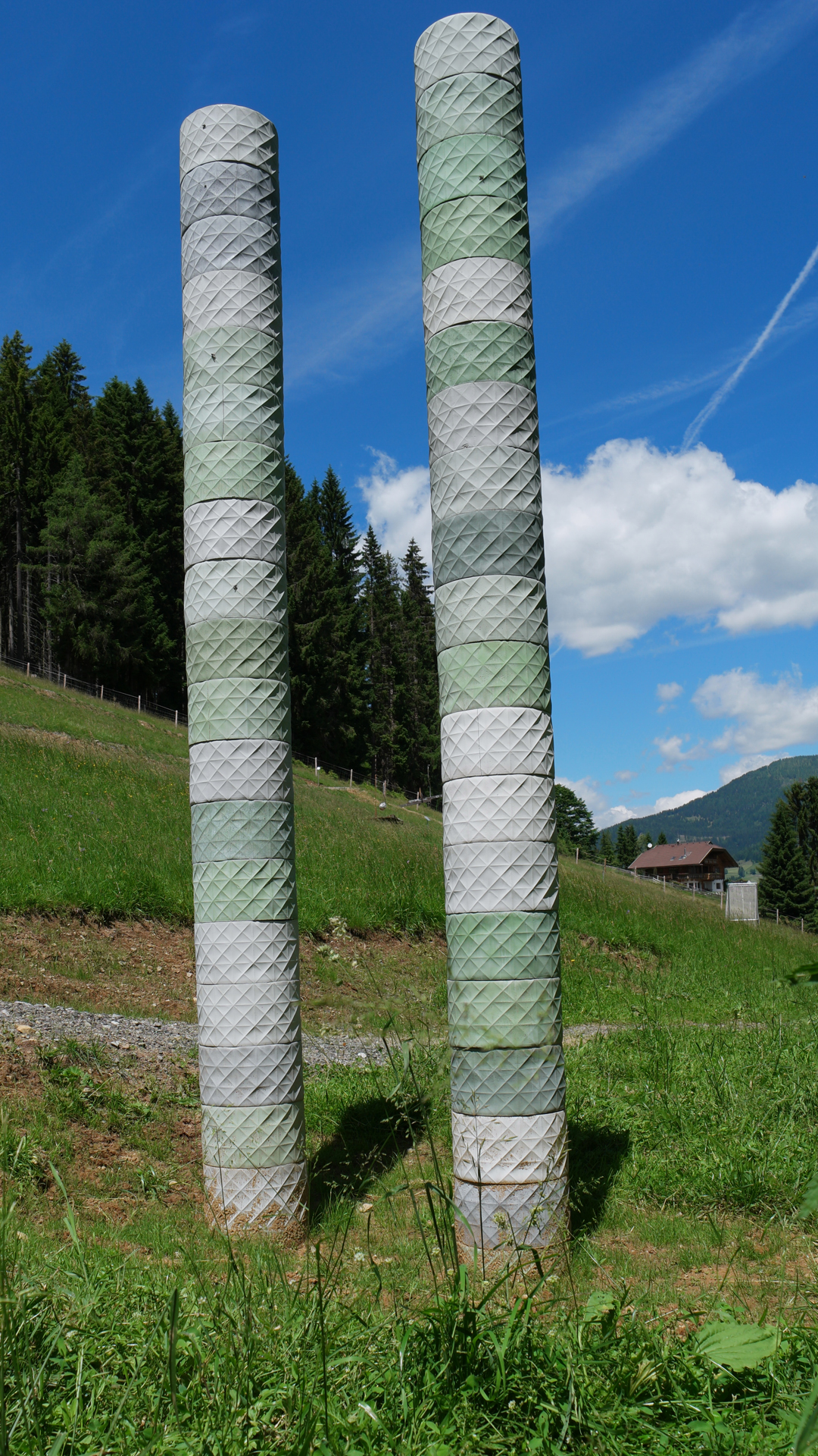 Die Installation "Passage" ist inspiriert von griechischen, antiken Säulen. Die Anordnung der schmalen Stelen ist so gewählt, dass man gerade noch hindurchgehen kann, um die körperliche Enge der Installation mit all ihrer Filigranität im Kontrast zur Weite der Umgebung als Kontrast zu erspüren.
