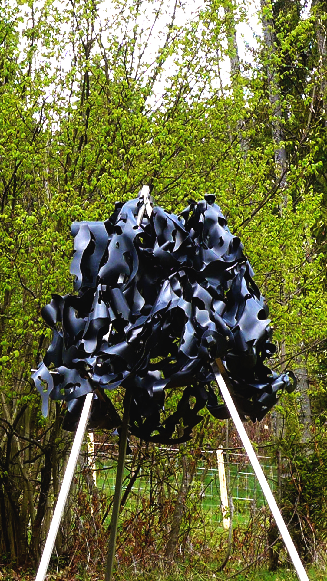 Ihre Arbeit RÉCOLTE D’OMBRE wiederum ist explizit auf den Außenraum abgestimmt. Dabei ersetzen witterungsbeständige Gummimatten das Papier. Getragen werden diese von einer Edelstahlkonstruktion, die sowohl in Hinblick auf die Form, als auch auf ihre Funktion an eine Heuharfe erinnert. So erntet die Künstlerin gewissermaßen, wie der Titel schon impliziert, die Früchte ihrer künstlerischen Arbeit.