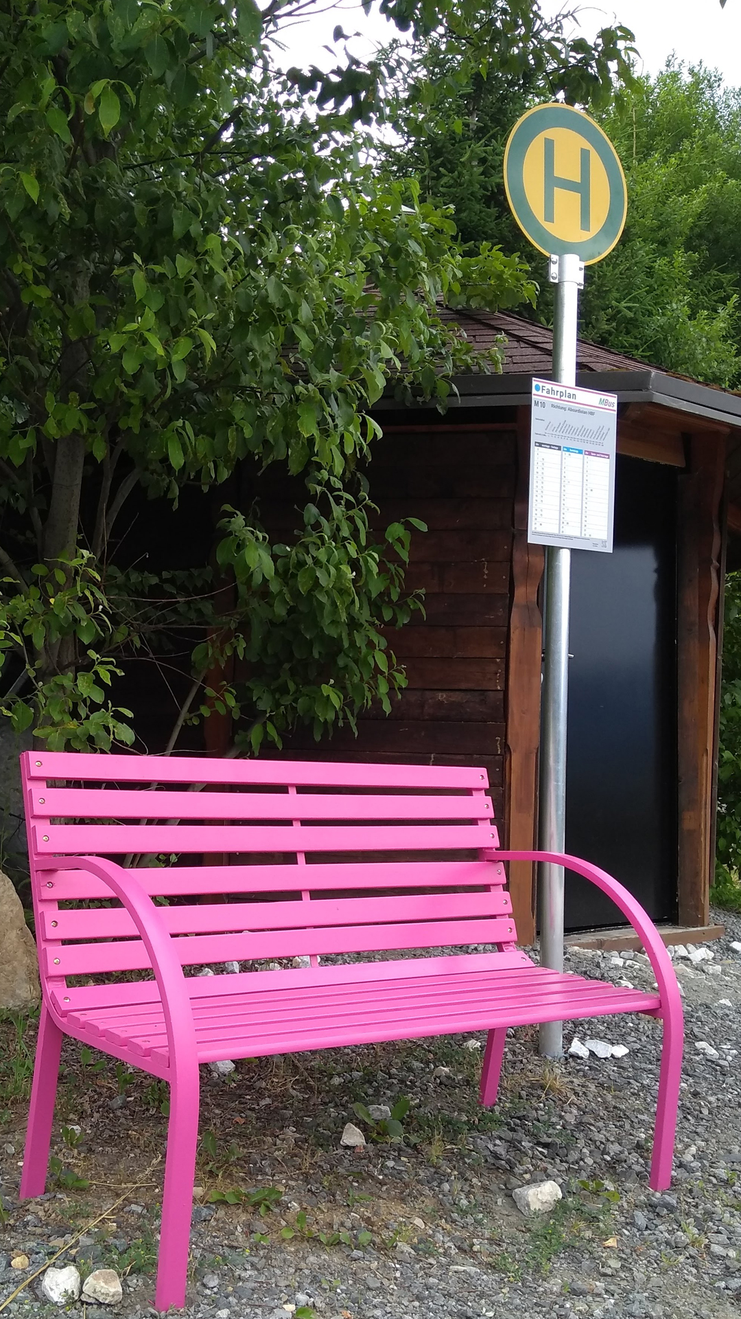 Das ungarische Künstlerkollektiv MI.IZA agiert, wie auch der Streetart-Künstler Banksy, vollkommen inkognito. Bisher schafften es die Protagonisten sogar, online überhaupt nicht in Erscheinung zu treten. Bei einem ihrer Aufenthalte in der art-lodge entstand die Idee der Bushaltestelle, mitten in der „Natur“ auf dem Berg. „Bitte anhalten“ steht für den Wunsch des ermüdeten Städters, mitgenommen und zurück ins Tal (in die Zivilisation) gebracht zu werden. Die Protagonisten von MI.IZA hingegen zieht es in die Natur, wo sie tagelang unbeobachtet in und mit der Wildnis leben und dort ein hartes Survivaltraining mit der Entwicklung von künstlerischen Interventionen verbinden. Die Bushaltestelle steht symbolisch sowohl für die oft mangelhaft geplanten Infrastrukturen des öffentlichen Verkehrs als auch in Bezug auf den gängigen Begriff von Natur in der heutigen Industriegesellschaft: Während Ruhebänke an touristischen Wanderwegen oft an völlig absurd scheinenden Orten bereit stehen, ist der Wartebereich einer Haltestelle für die Künstler ein logischer Ort, eine Bank zu platzieren, um die Wartezeit erträglicher zu machen. Hierbei spielt es keine Rolle, wann und ob überhaupt ein Bus kommen wird und wo sein Ziel liegt. Die Zeit wird also genauso gedehnt, wie der Begriff der Natur, die hier, an einer Straße, in einer von der Land- und Forstwirtschaft geprägten Umgebung in ihrer Urform so nicht mehr existiert.