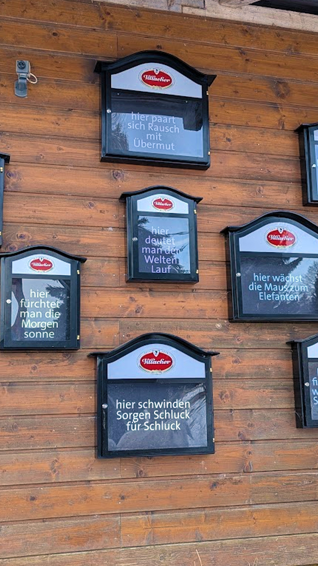 Für das Projekt hier am Berg beleuchtet Klaus den Lebensraum Wirtshaus, wo gehockt, gelitten, gestritten und gefeiert wird, in Form von teils lustigen, teils hintergründigen Aussagen. Hierzu bedient er sich eines Dutzends Gasthaus-Schaukästen, die an der Außenwand der Atelierhütte hängend, das Versprechen eines Angebotes suggerieren. Aber hier, wo es keine Gastronomie (mehr) gibt, bleiben die Sprüche nur leere Versprechungen...