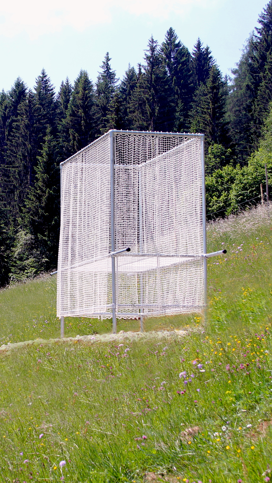 Bett im Freien. Das tragbare Bett unter freiem Himmel stellt etwas Intimes in der Öffentlichkeit zur Schau. Es lädt ein, sich mit der Phantasie in einen Raum hinein zu begeben, den man doch nicht körperlich betreten kann, und wirft die Frage auf, zu welchem Zweck diese Konstruktion dient: um Träume einzufangen, für sich allein, oder zu zweit allein sein, oder – in seiner Deutung als Sänfte oder Bahre – um irgendwohin geleitet oder gar abtransportiert zu werden. Freiwillig? Unfreiwillig?