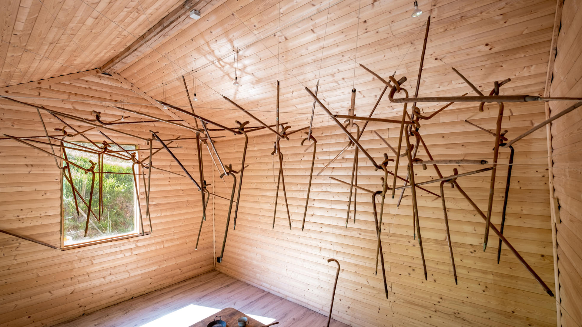 Solve et Coagula (lat: Löse und verbinde) ist eine alchemistische Schlüsselformel und beschreibt folgenden Prozess: Das Analysieren, Trennen oder Auflösen einer Eigenschaft und das anschließende Zusammenfügen zu einem besseren Ergebnis. Das Verbindende ist die Grundidee von Andrea Facius Rauminstallation aus 100 herrenlosen und zurück in die Anonymität geratenen Wanderstöcken, die alle ihre stützende Funktion über Stock und Stein hinter sich haben und sich nun beim „Fingerhakeln“ treffen. Gegengesetzte, ringende Kräfte sind hier das spürbare Element. Sie bilden die Tonlage für das Liniengefüge und sind das Grundgerüst für das Auf und Ab der Raumstruktur.